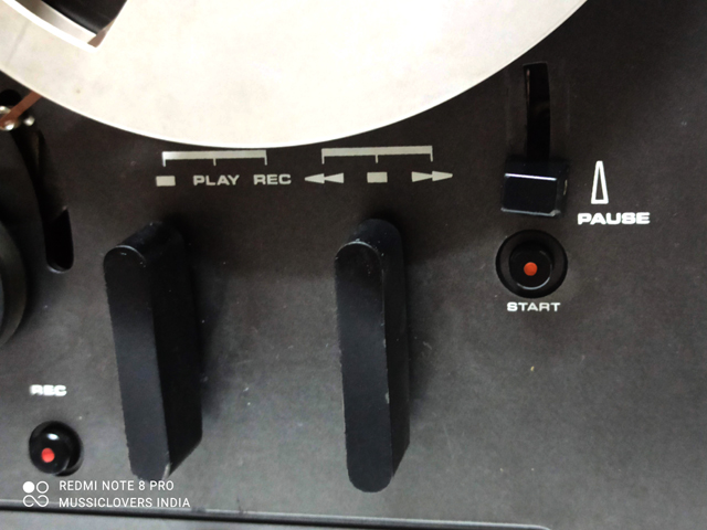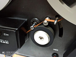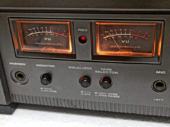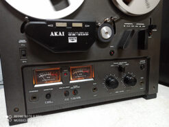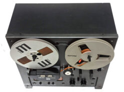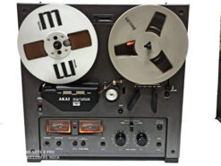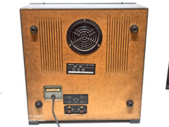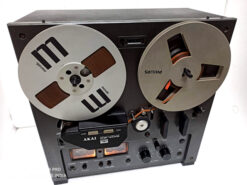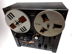 Classic vintage open reel recorder with 3 GX Head, 3 Motor, Auto reverse (playback only, not record), twin-lever transport selection mechanism, tape selector, two speeds (3¾ and 7½ ips), Large VU meters for playback & record level. Individual recording level control. RCA line in & out. Max reel capacity 7 inches. Full automatic stop. A slightly enlarged deck-plate meant that the 7″ reels fitted wholly within the boundaries of the recorder. Wooden case.